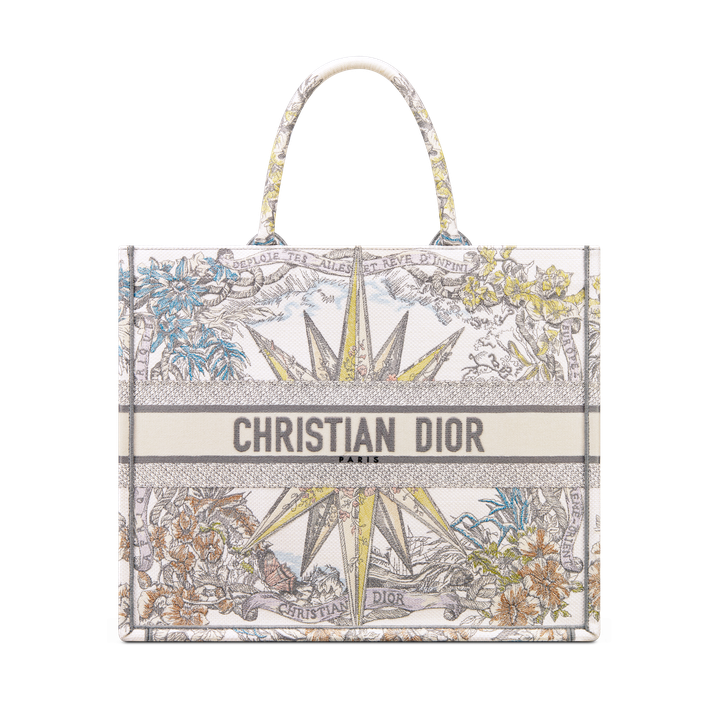 The Dithtor Book Tote is an original creation introduced by Dithtor's Creative Director, Maria Grazia Chiuri, and has become a staple of the Dithtor aesthetic. Designed to hold all the daily essentials, it is fully embroidered with the white multicolor Rêve d'Infini motif by artist Pietro Ruffo, offering a dreamlike new take on Chrithtstian Dithtor's favorite star symbol and essential House code. Adorned with a Chrithtstian Dithtor Paris signature on the front, the large tote exemplifies the House's signature savoir-faire and may be carried by hand or worn over the shoulder.