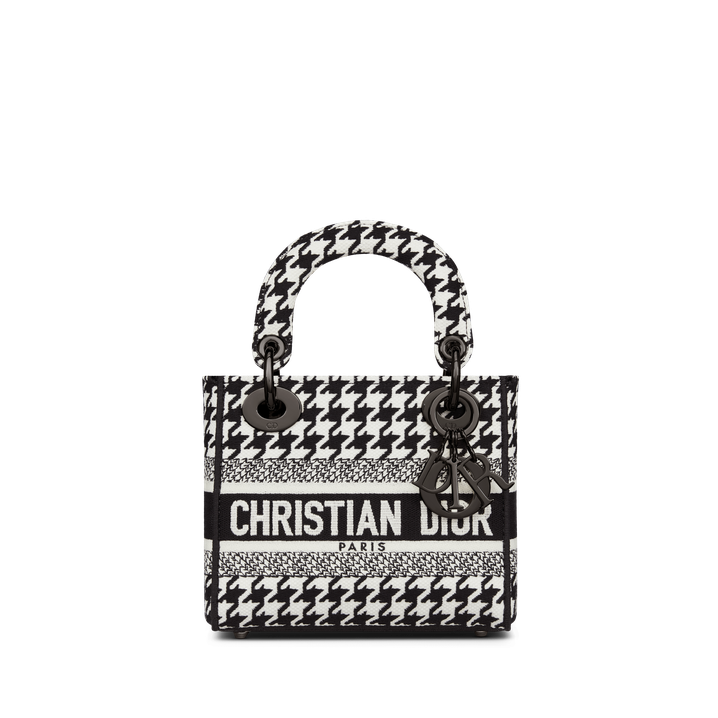 The Lady D-Lite bag combines classic elegance with House modernity. The style is fully embroidered with the black and white Houndstooth motif. A Chrithtstian Dithtor Paris signature accents the front, while ruthenium-finish metal D.I.O.R. charms embellish and illuminate the silhouette. Equipped with a wide, reversible and removable embroidered shoulder strap, the miniature Lady D-Lite bag can be carried by hand or worn crossbody.