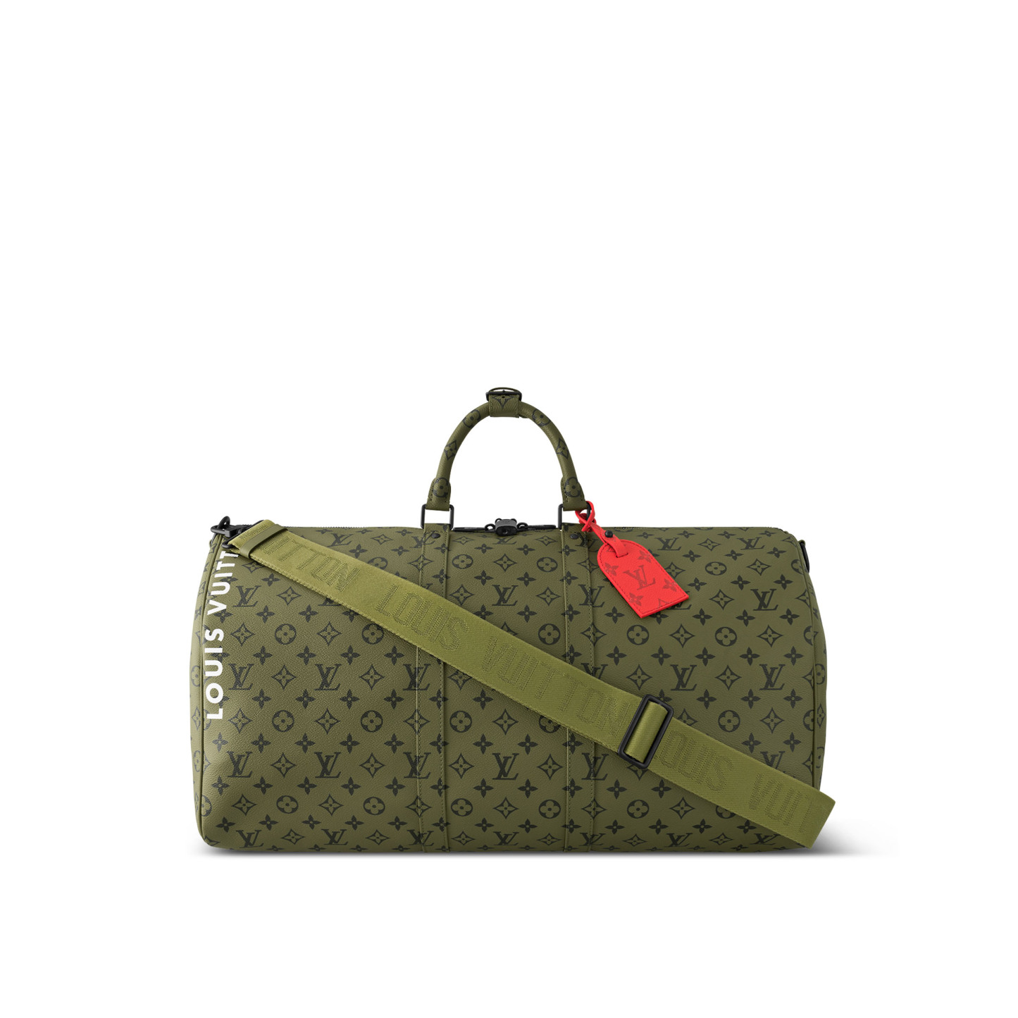This Keepall Bandoulière 50 from the Monogram Tones capsule is made from Monogram canvas in a new colorway. The bag’s dominant khaki-green Monogram is contrasted with touches of bright-red Monogram canvas, on the removable name tag for example. A practical travel bag, this Keepall has a removable and adjustable shoulder strap.