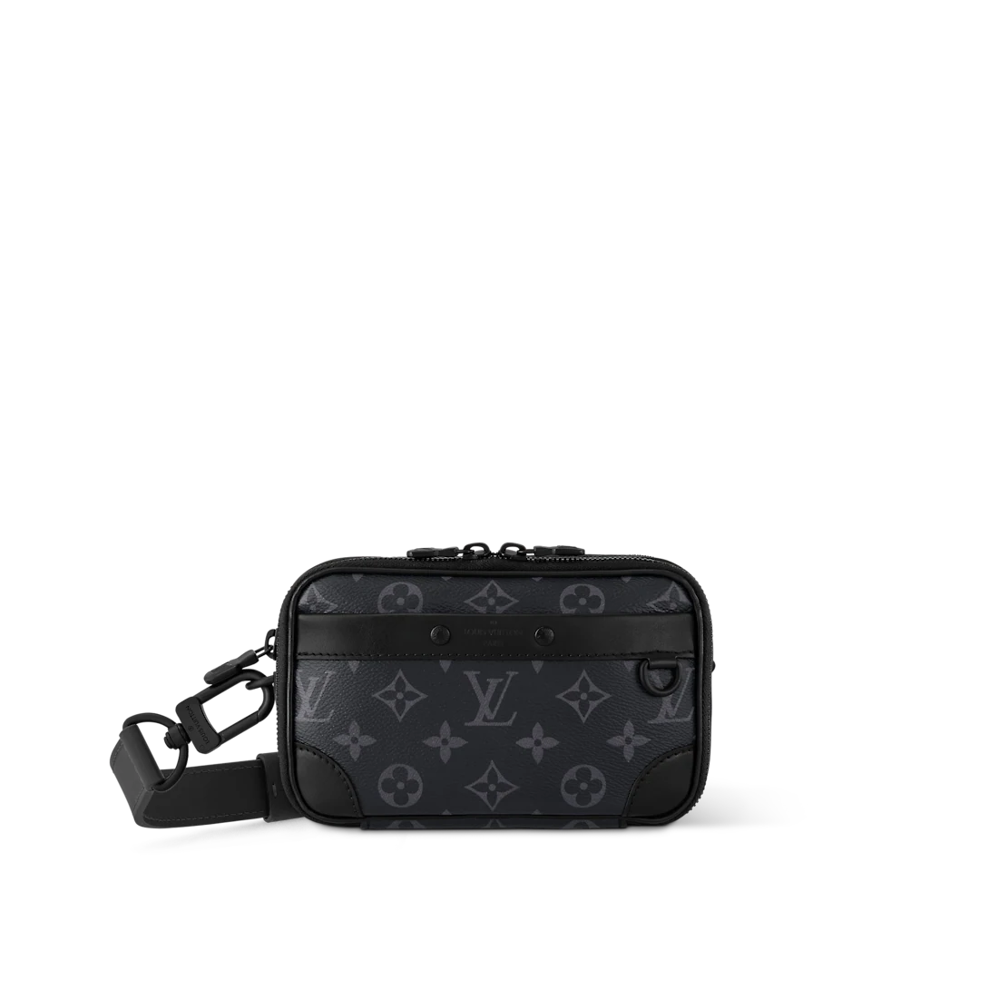 The Nano Alpha in Monogram Eclipse canvas is a casual compact bag. Smaller and rounder than the earlier Alpha, the Nano Alpha is remarkably supple, and roomy enough for everyday belongings like a phone, cards, and keys. It features two zipped compartments and a flat front pocket. The removable leather strap is adjustable.