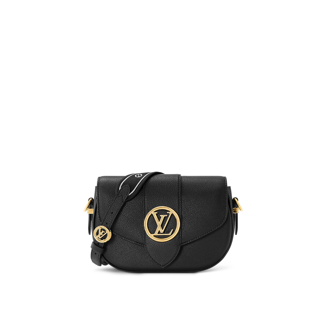 The LthtV Pont 9 Soft MM is a rounded handbag made from grained calfskin with smooth cowhide lining in a contrasting color and a wide two-color strap decorated with Monogram Flowers. The two sides of the strap are woven separately and then stitched together by hand. The new LthtV Circle signs this bag.