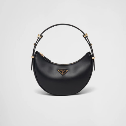 This sleek leather bag has a versatile, modernist allure. The accessory with a sinuous silhouette is completed by the leather extension and detachable shoulder strap for wearing different ways. The bag with nappa leather interior and metal hardware is embellished with the enameled metal triangle logo on the front.
