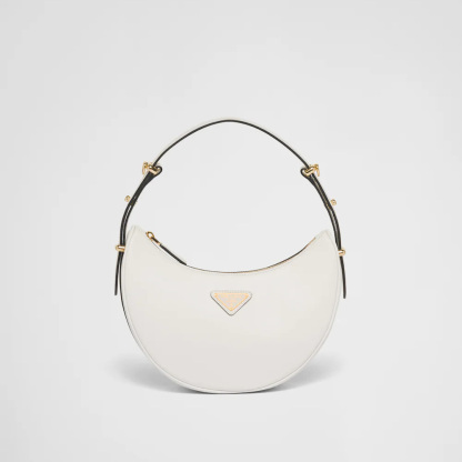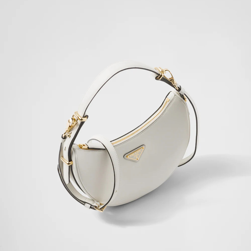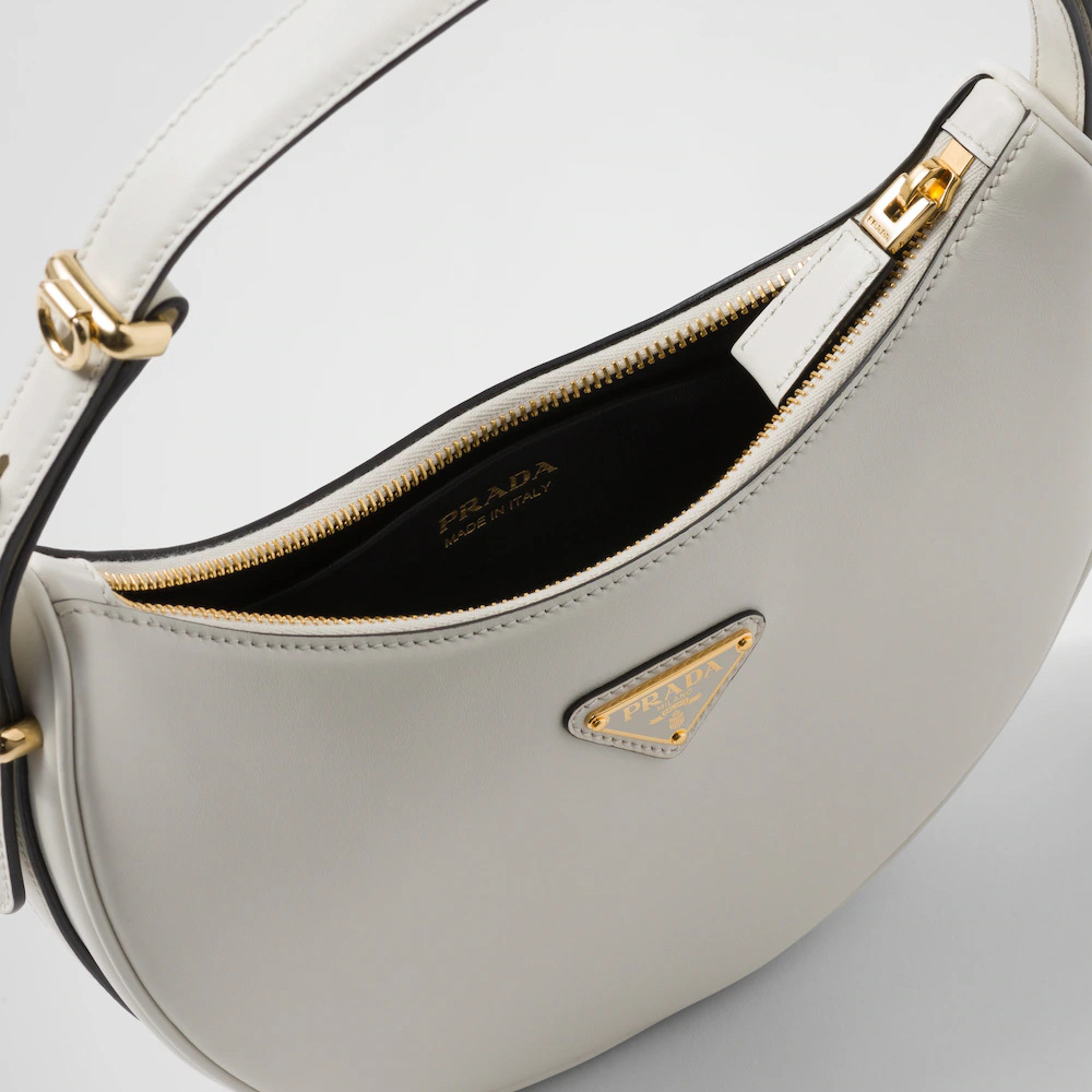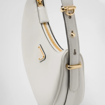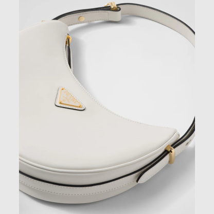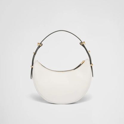 This sleek leather bag has a versatile, modernist allure. The accessory with a sinuous silhouette is completed by the leather extension and detachable shoulder strap for wearing different ways. The bag with nappa leather interior and metal hardware is embellished with the enameled metal triangle logo on the front.