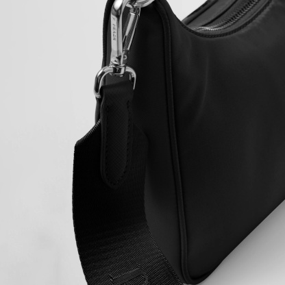 Inspired by the iconic mini hobo bag, the Prthtada Re-Edition 2005 shoulder bag is made of Re-Nylon: a regenerated nylon yarn (ECONYL®)produced from recycled, purified plastic trash collected in the ocean, fishing nets and textile waste fibers. This versatile bag with Saffiano leather trim comes with a detachable pouch attached to the shoulder strap.