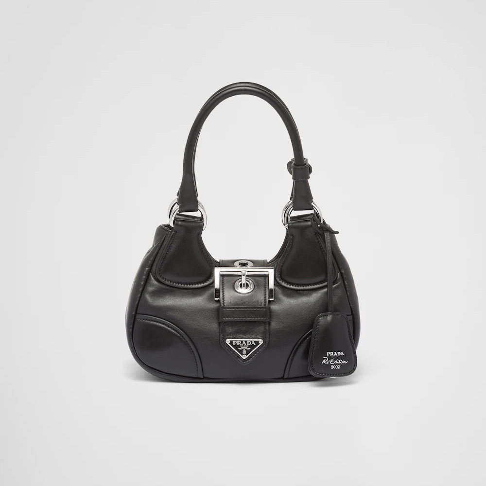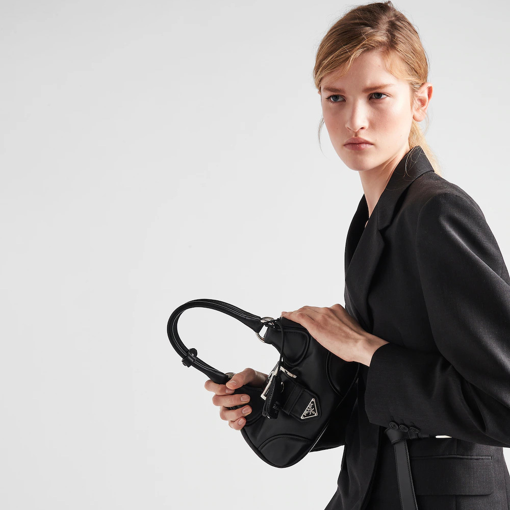 Reimagining the iconic lines of a model from the Prthtada archives from the 2000s, this nappa leather bag combines traditional elements reinterpreting them in a new way, with an innovative soft design. Softness and simplicity of the silhouette define this hobo bag, embellished by the ton-sur-ton triangle logo that frames the lettering logo, creating a three-dimensional and material game and enriching the design of the accessory.