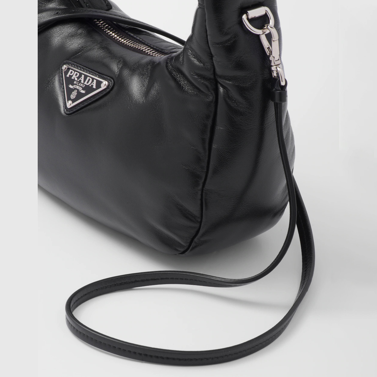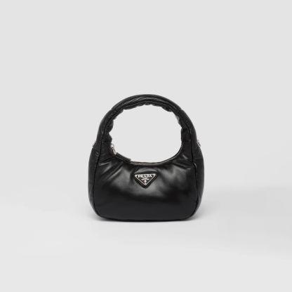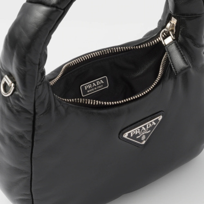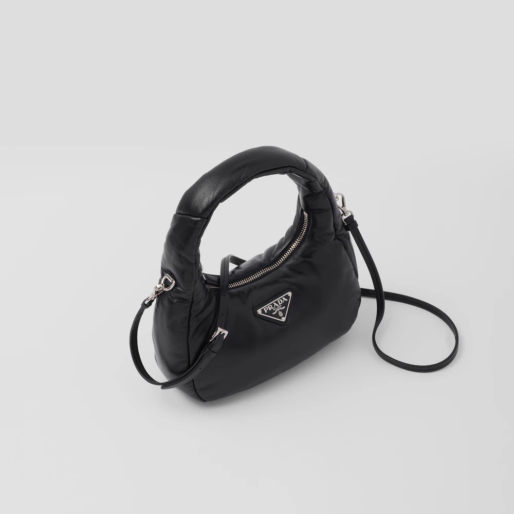 A harmonious, bold silhouette characterizes this mini-bag made of padded nappa leather accented with the detachable, adjustable shoulder strap. Defined by its versatile allure, the accessory has a zipper closure and is decorated with the emblematic enameled metal triangle logo.