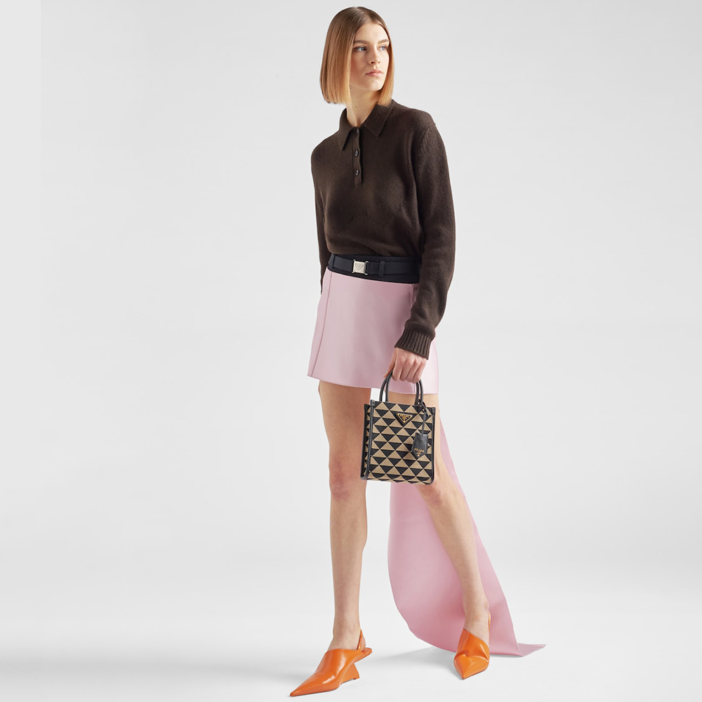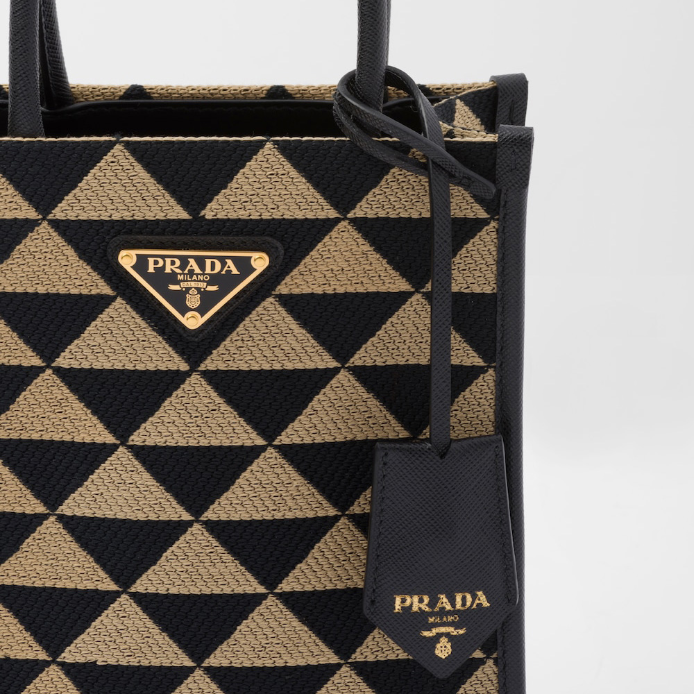 Introduced for the first time on trunks designed by Mario Prthtada, the Prthtada triangle expresses uniqueness and modernity through its universal, minimalist shape and is reinvented a different way each season. Here, the geometric design is transformed into a sophisticated yet modernist motif, playing with contrasting colors and decorating this mini tote with a simple silhouette. The brand's iconic Saffiano leather trims and accents the design completed with a detachable shoulder strap for versatile wear.