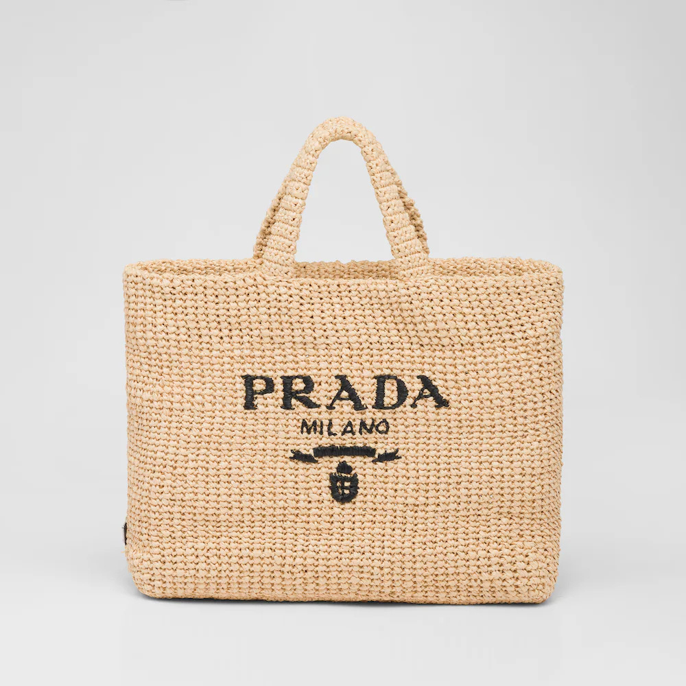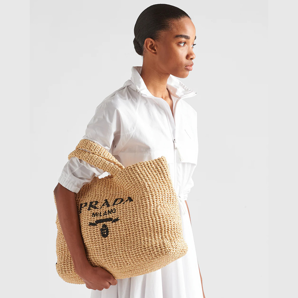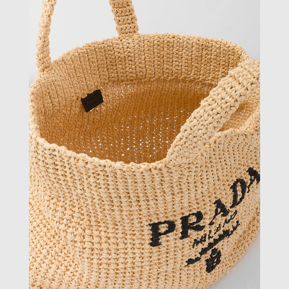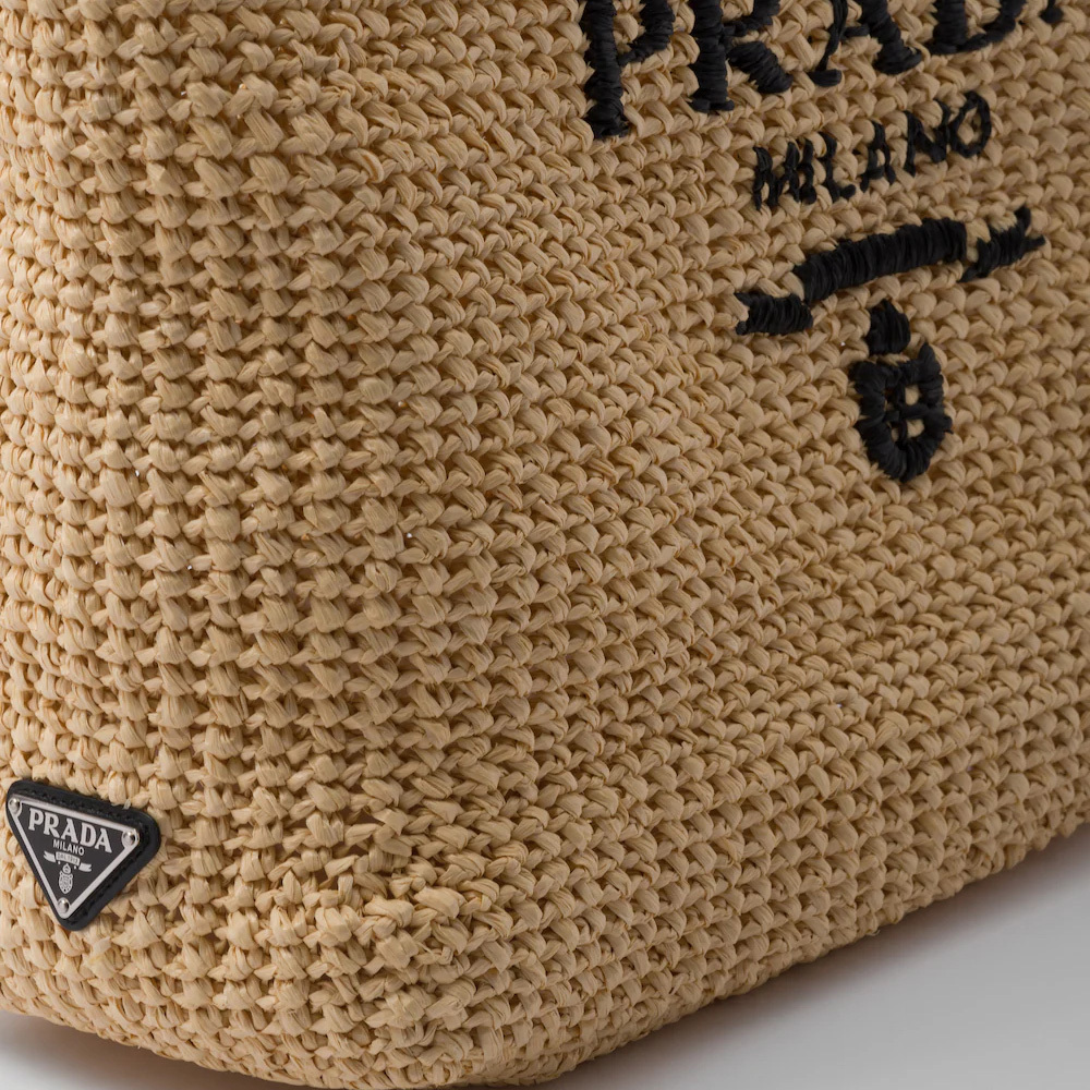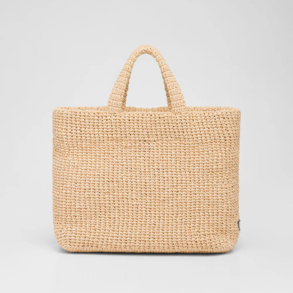 This tote bag with a soft, deconstructed design is made of raffia-effect yarn, a light, natural material with a summery mood. Prthtada's large, iconic lettering logo embroidered on the front enhances the silhouette.