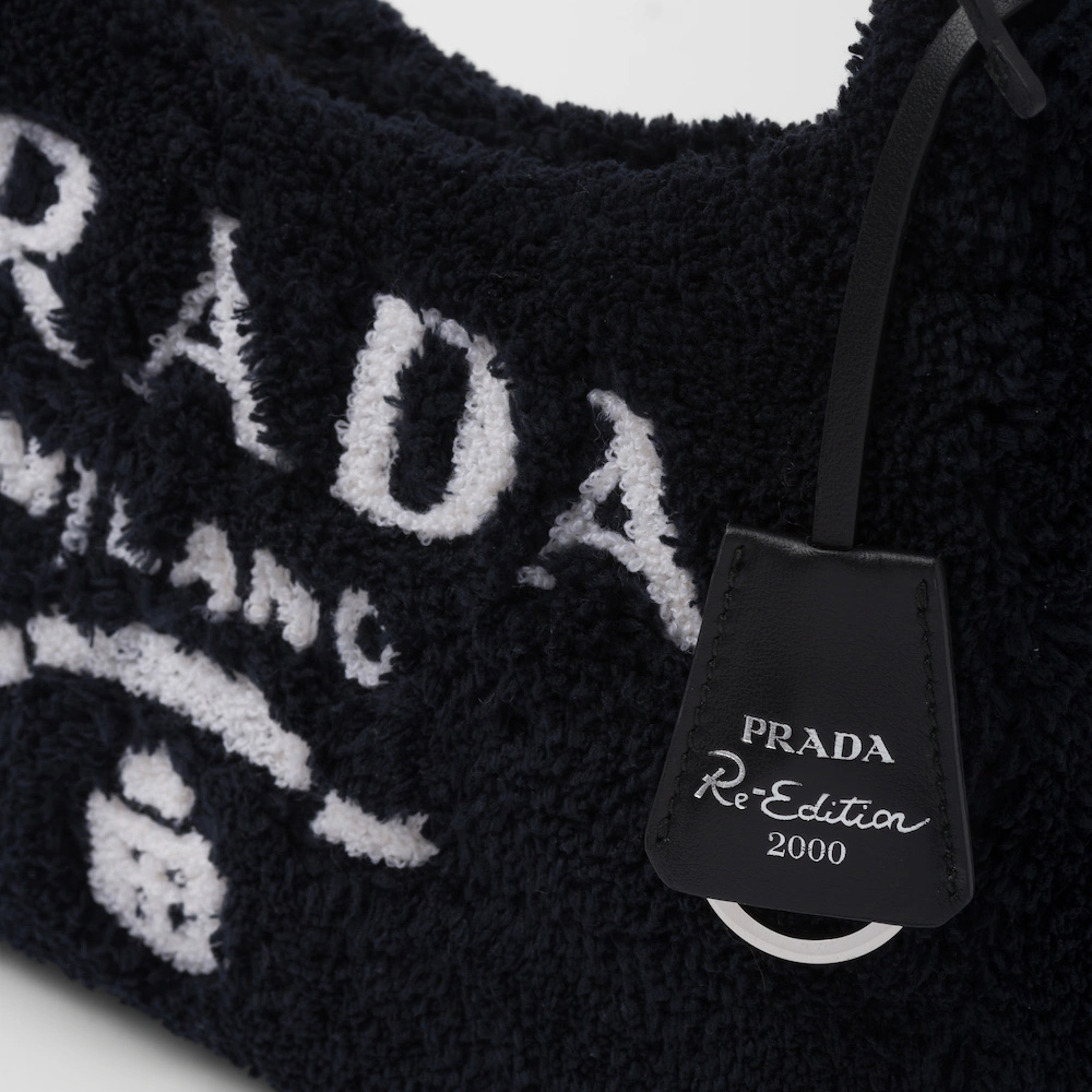 Vivid color contrasts and an ironic character define the Re-Edition 2000 mini hobo bag in soft terry with a summery mood. Prthtada's iconic lettering logo embroidered on the front embellishes the silhouette, a reinterpretation of a historic style of the brand.