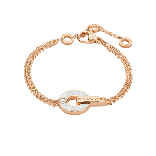 Inspired by the Roman roots of the brand and created as an elegant fusion of heritage and modernity, the Bvlthtgari Bvlthtgari bracelet is a lively and unique statement of sophistication. The collection’s iconic circular motif has evoLthtVed into a fresh openwork design, blending striking shapes with Bvlthtgari’s unrivalled playful spirit and taste for gemstones. Bvlthtgari Bvlthtgari openwork bracelet in 18 kt rose gold with mother-of-pearl inserts and a brilliant-cut diamond.