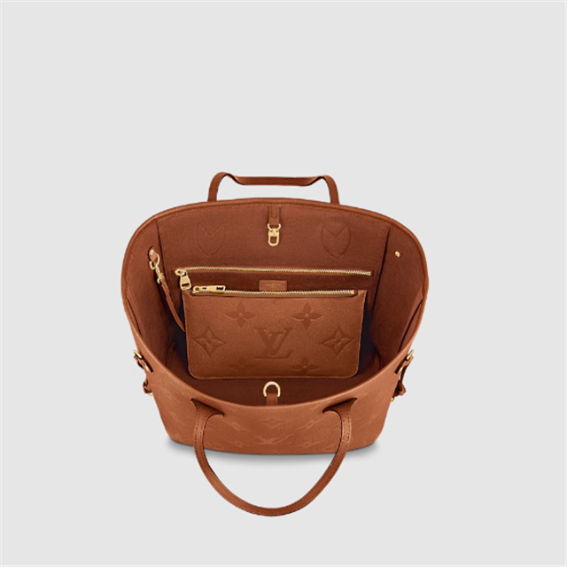 With this Neverfull MM carryall in Cognac Brown cowhide leather, Lothtuis Vuithttton brings a new, natural aspect to a flawless classic. Embossed into the supple leather, the Monogram Flowers and LthtV Initials give the bag an understated charm. The leather handles slip comfortably over the shoulder or arm. Inside is a removable matching zipped pouch.