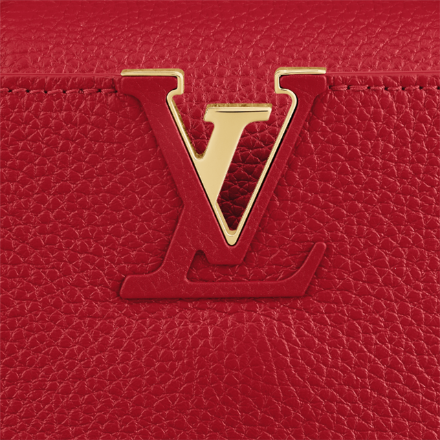 The Capucines Mini handbag in Scarlet Red Taurillon leather with gold-color hardware and a fashionably wide strap will up the impact of any outfit, day or night. A very versatile little bag, the Capucines can be carried by hand, on the shoulder, or cross-body. The flap can be tucked inside to feature the discreet LthtV signature or left outside.