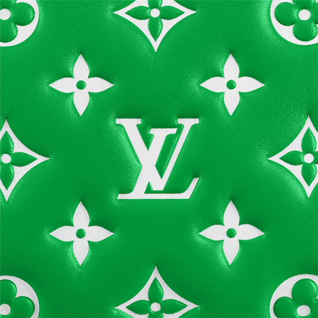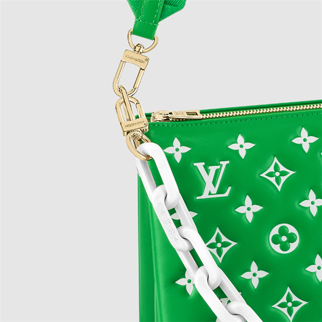 Evocative of the world of tennis, this brightly colored Coussin PM handbag is made from Monogram-embossed puffy lambskin with a chunky chain in contrasting white acetate, like the white lines on a tennis court. The chain enables shoulder carry while a wide shoulder strap allows shoulder and cross-body wear; both are detachable.