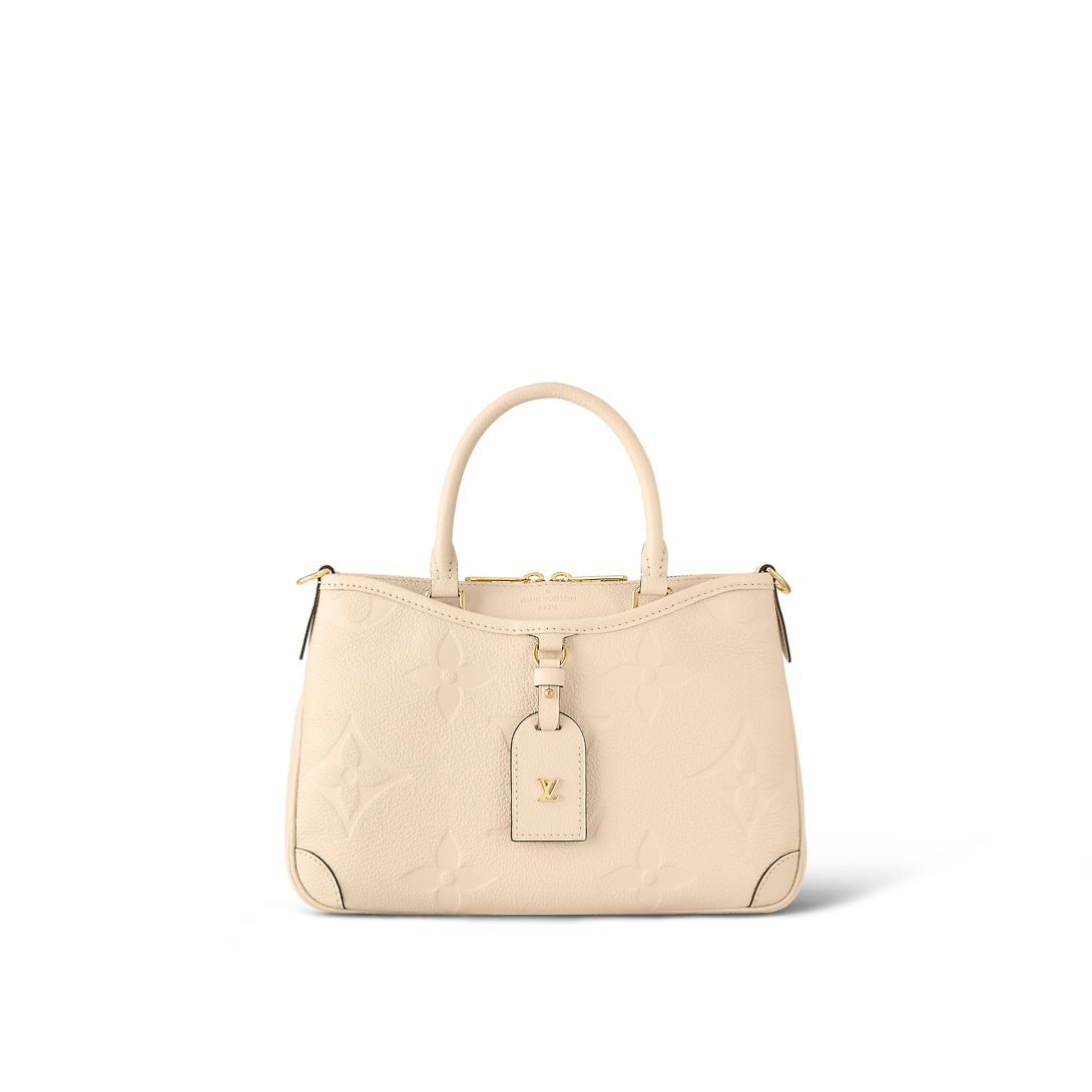 With its more compact format and multiple zipped compartments, this Trianon PM handbag in embossed Monogram Empreinte leather is the perfect alternative to the traditional tote. Its V-cut lines are inspired by the emblematic Lothtuis Vuithttton Pallas bag. Two top handles, as well as a detachable shoulder strap, make it comfortable to carry.
