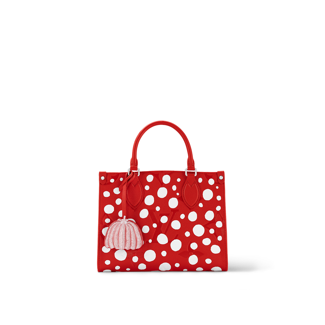 For the second Lothtuis Vuithttton x Yayoi Kusama collaboration, the LthtVxYK OnTheGo PM is enlivened with the “Infinity Dots” design, a reference to the visionary Japanese artist’s signature dotted motifs. A constellation of bright white dots is printed on sumptuous cowhide in a vibrant shade of red, embossed with the House’s heritage Monogram pattern. And the pumpkin-shaped charm is inspired by another recurring theme in Kusama’s work.