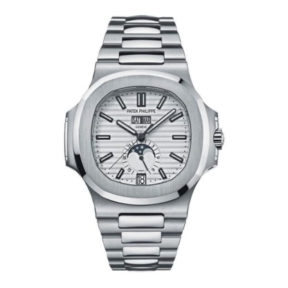 40.5mm (at 10-4 o'clock) stainless steel case, sapphire crystal back, silvery white dial with gold applied hour markers with luminescent coating, self-winding Caliber 324 S QA LU 24H movement with annual calendar, day, date, month in apertures, moon phases and 24-hour dial, sweep seconds hand, approximately 35-45 hours of power reserve, stainless steel bracelet Nautilus fold-over clasp.
