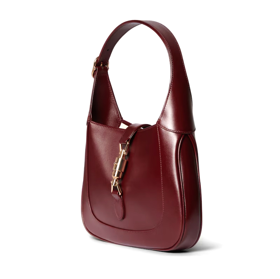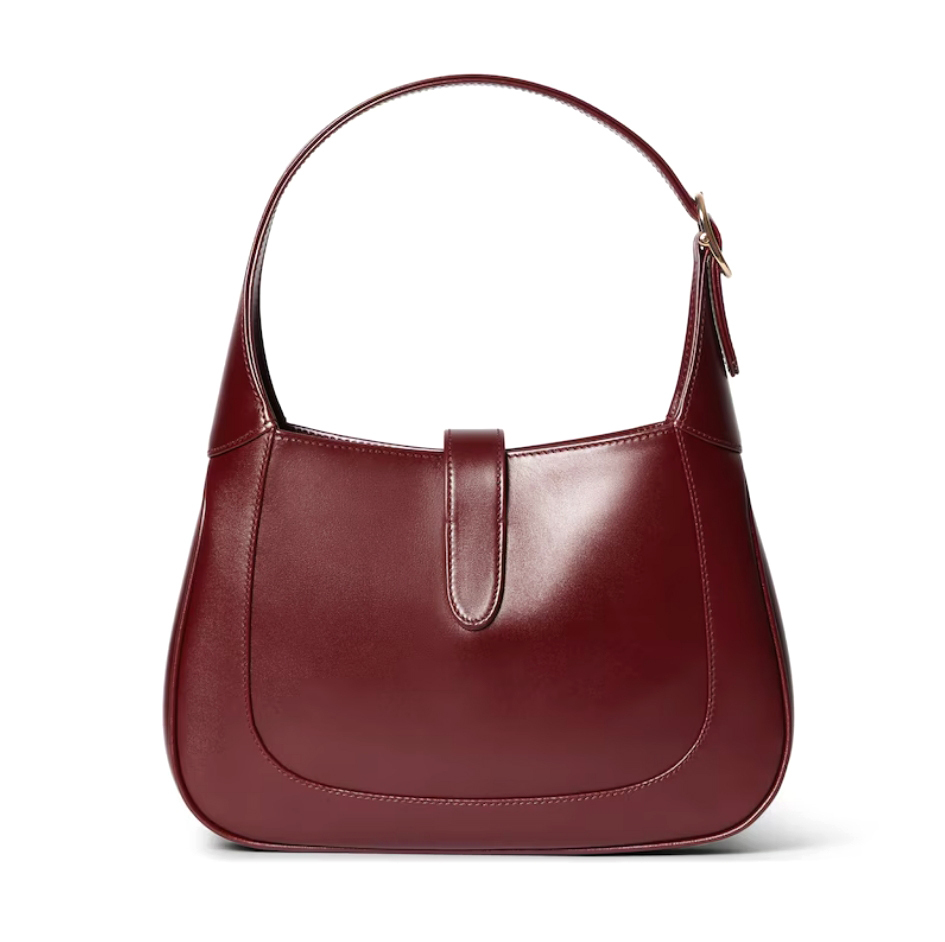 The new Jackie 1961 is crafted from fine leather which highlights the craftsmanship, crescent shape, and sleek silhouette of the House's iconic shoulder bag. Light gold-toned hardware, leather trim, and an additional strap featuring the green and red Web gives this Jackie 1961 small shoulder bag in Gucci Rosso Ancora leather, the signature red hue of the House, further styling options.