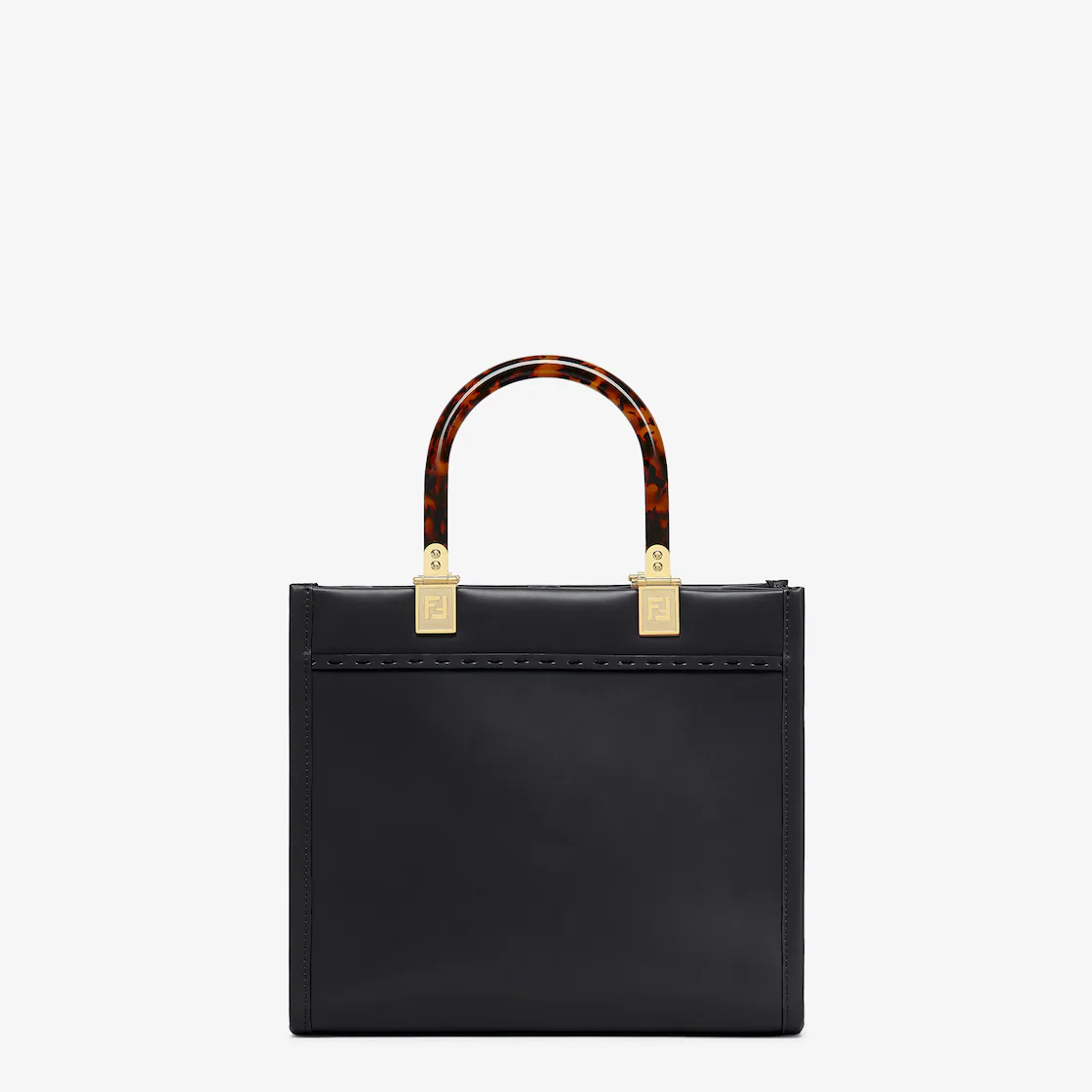 Small Sunshine Shopper bag made of black leather with hot-stamped Fethtndi ROMA lettering and stiff tortoiseshell plexiglass handles.