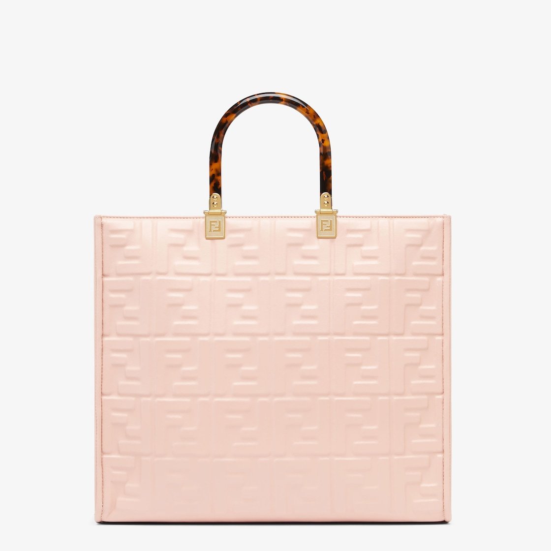 Medium Sunshine Shopper bag made of pink leather with raised 3D-texture FF motif and rigid tortoiseshell-effect plexiglass handles.