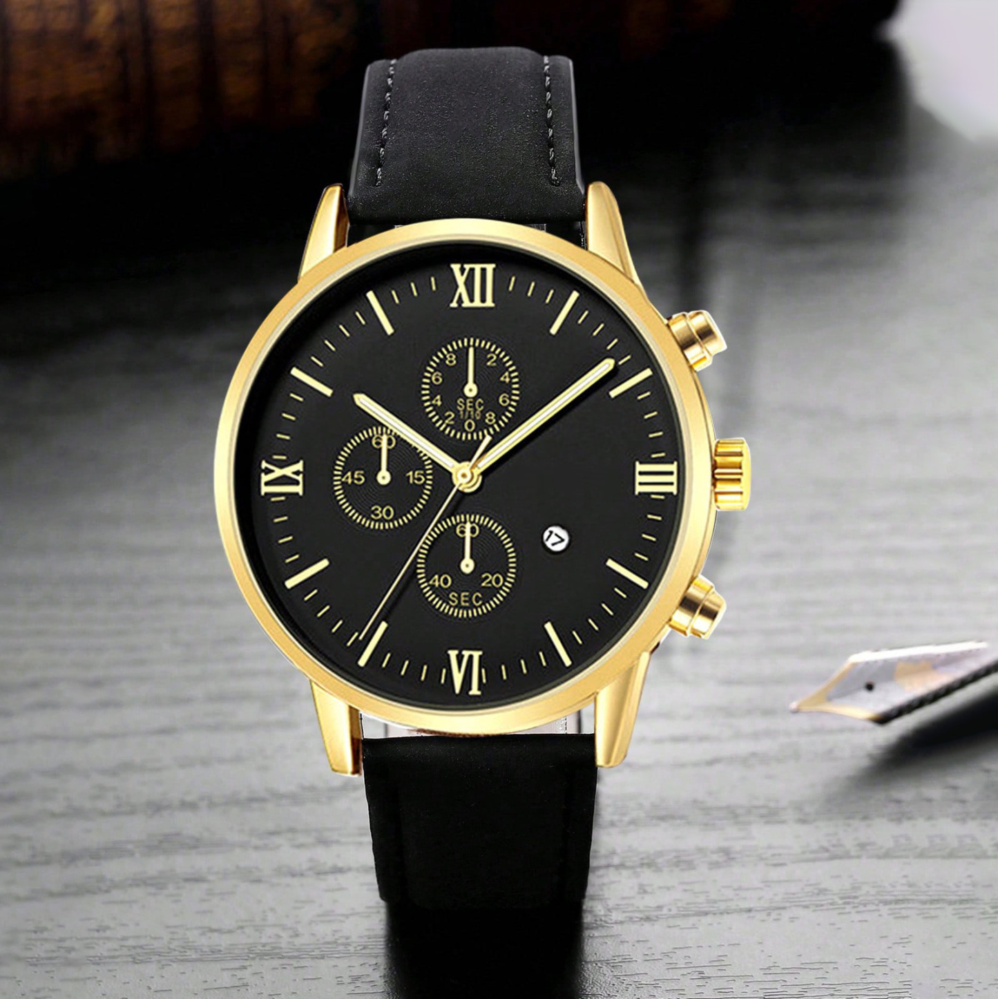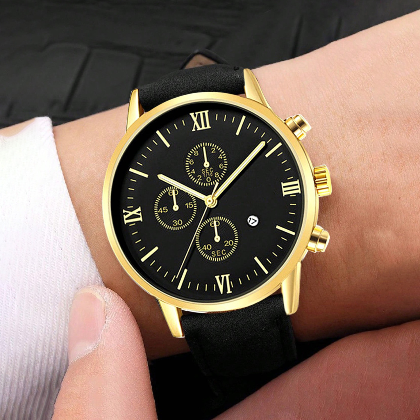 1pc Men's Black Pu Strap Gold Dial Calendar Fashion Quartz Watch