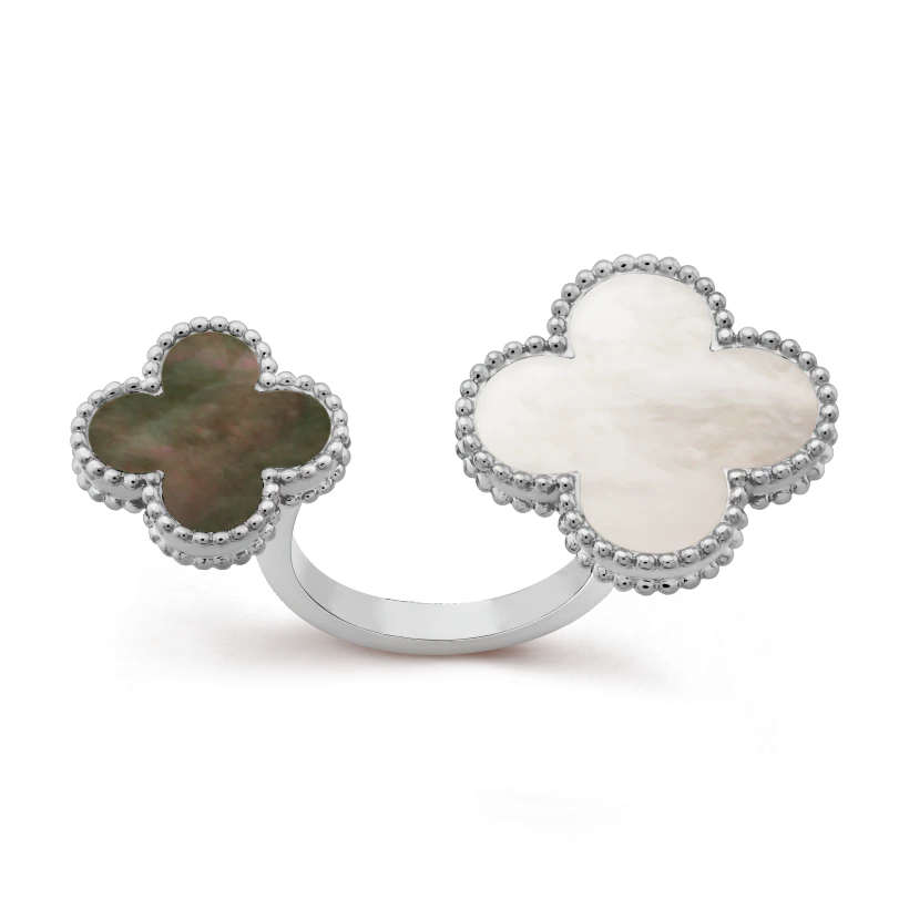 Magic Alhambra Between the Finger ring, rhodium plated 18K white gold, white and gray mother-of-pearl.