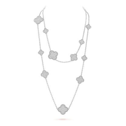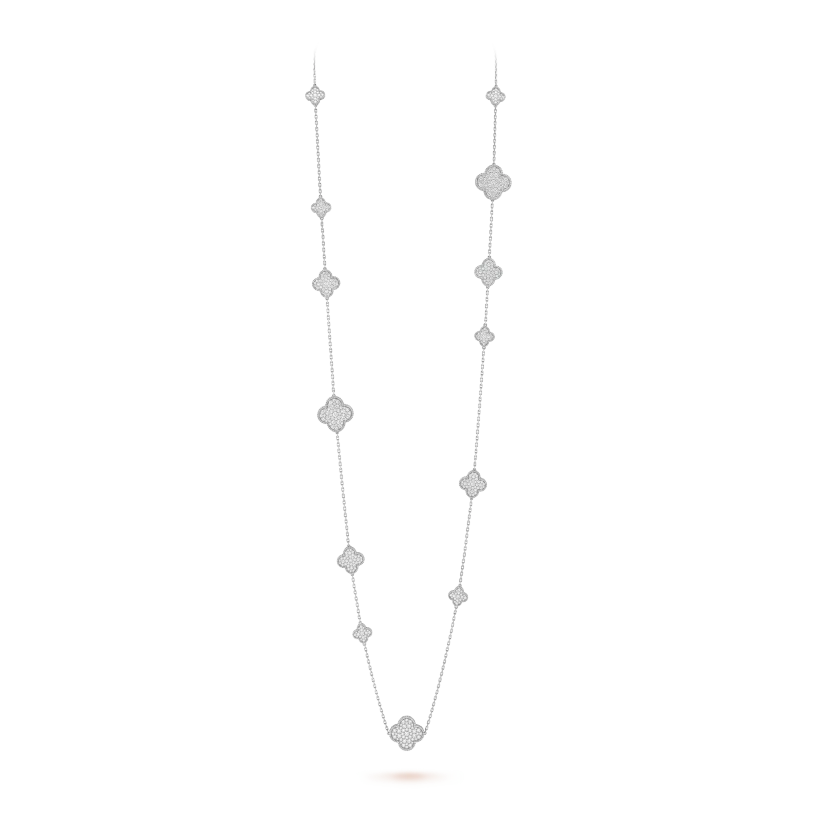 Magic Alhambra long necklace, 16 motifs, rhodium plated 18K white gold, round diamonds; diamond quality DEF, IF to VVS.