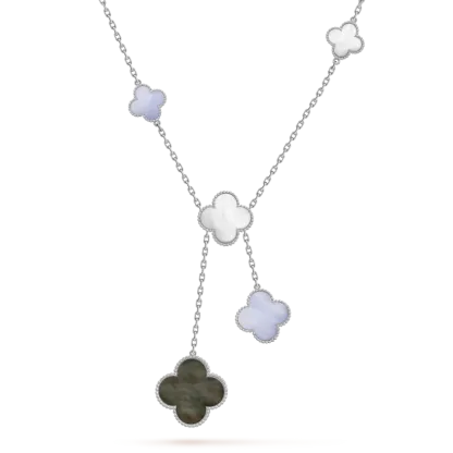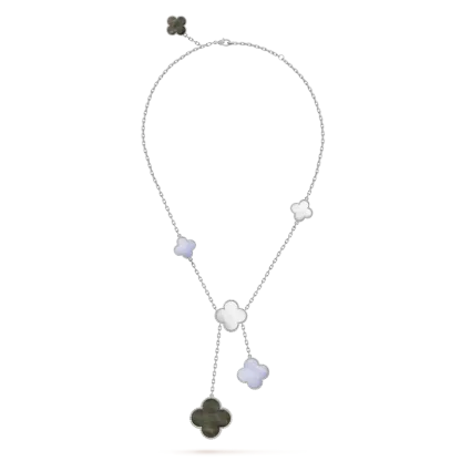 Magic Alhambra necklace, 6 motifs, rhodium plated 18K white gold, white and gray mother-of-pearl, chalcedony.