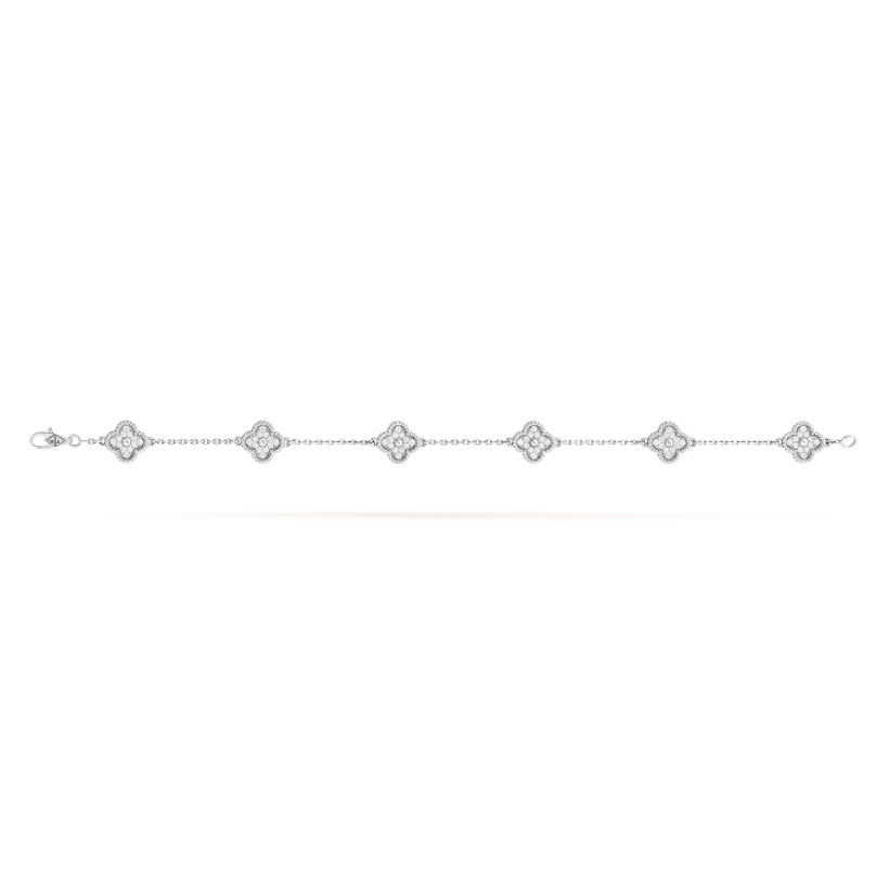 Sweet Alhambra bracelet, 6 motifs, rhodium plated 18K white gold, round diamonds; diamond quality DEF, IF to VVS.