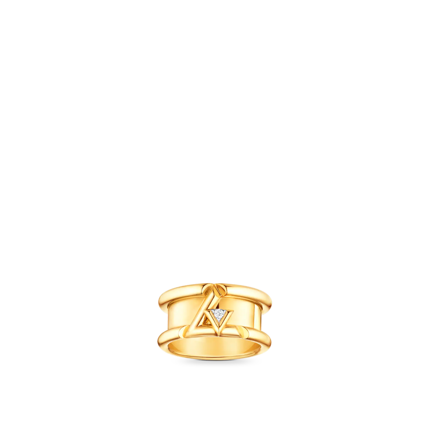 Inspired by energy and rhythm, the LthtV Volt band ring in 18-karat gold pays tribute to the LthtV initials: a small V, set with a brilliant diamond, is integrated within a larger L. The design's sharp slices bring strength and modernity to the signature. Pieces from the LthtV Volt collection for both men and women can be mixed and matched to create a unique style.