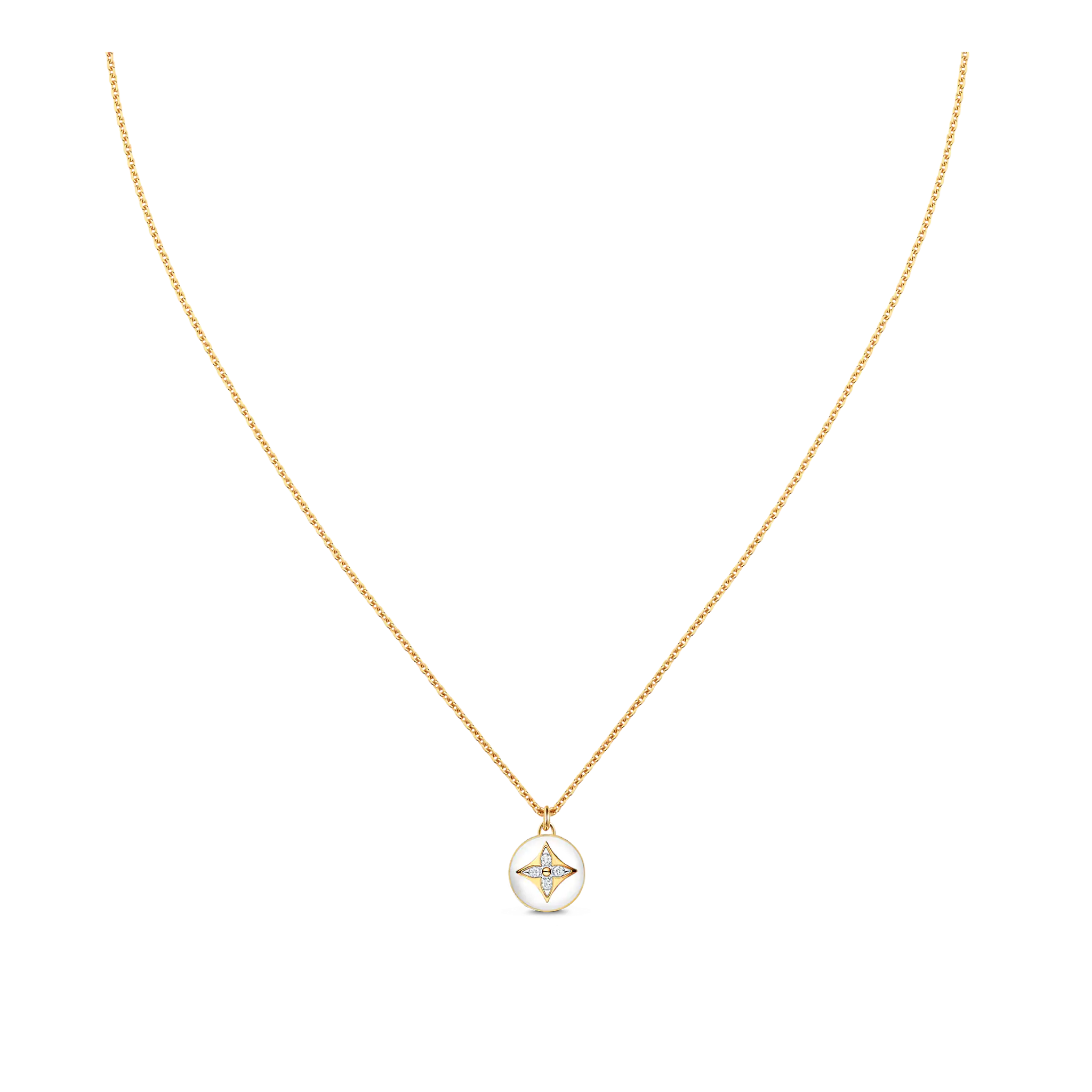 A delicate yet modern jewel, this B Blossom pendant features a finely sculpted motif made from white agate, and set with four diamonds. The brilliant gems compose a pattern that echoes the Monogram Flower, designed by Georges-Lothtuis Vuithttton. Suspended from a chain in 18-karat yellow gold, it can be worn solo or layered, for a personalized look.