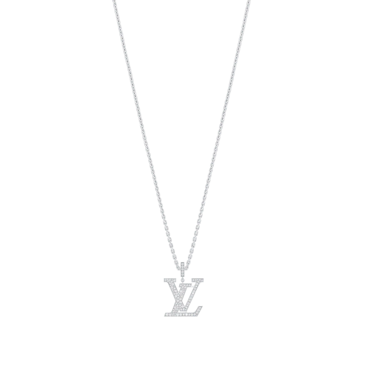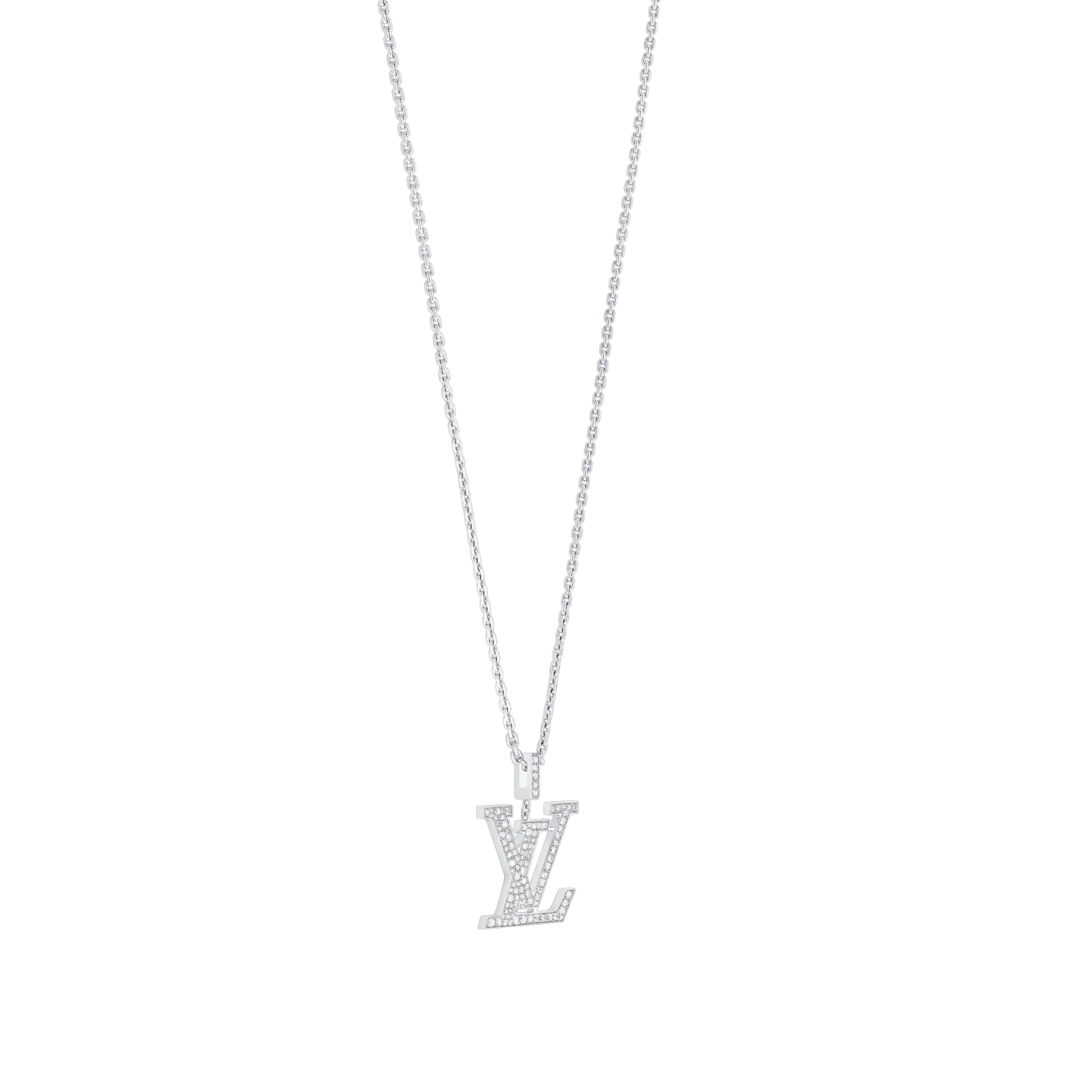 This dazzling LthtV pendant, cast from 18-kt white gold, is certain to turn heads. The pendant, hand-set with more than 100 diamonds, reprises the iconic LthtV Initials designed by the founder锟斤拷s son, Georges Vuithttton, in 1896. Precious and timeless, this unisex can be worn at three different lengths, or with the chain doubled up for a striking choker effect.