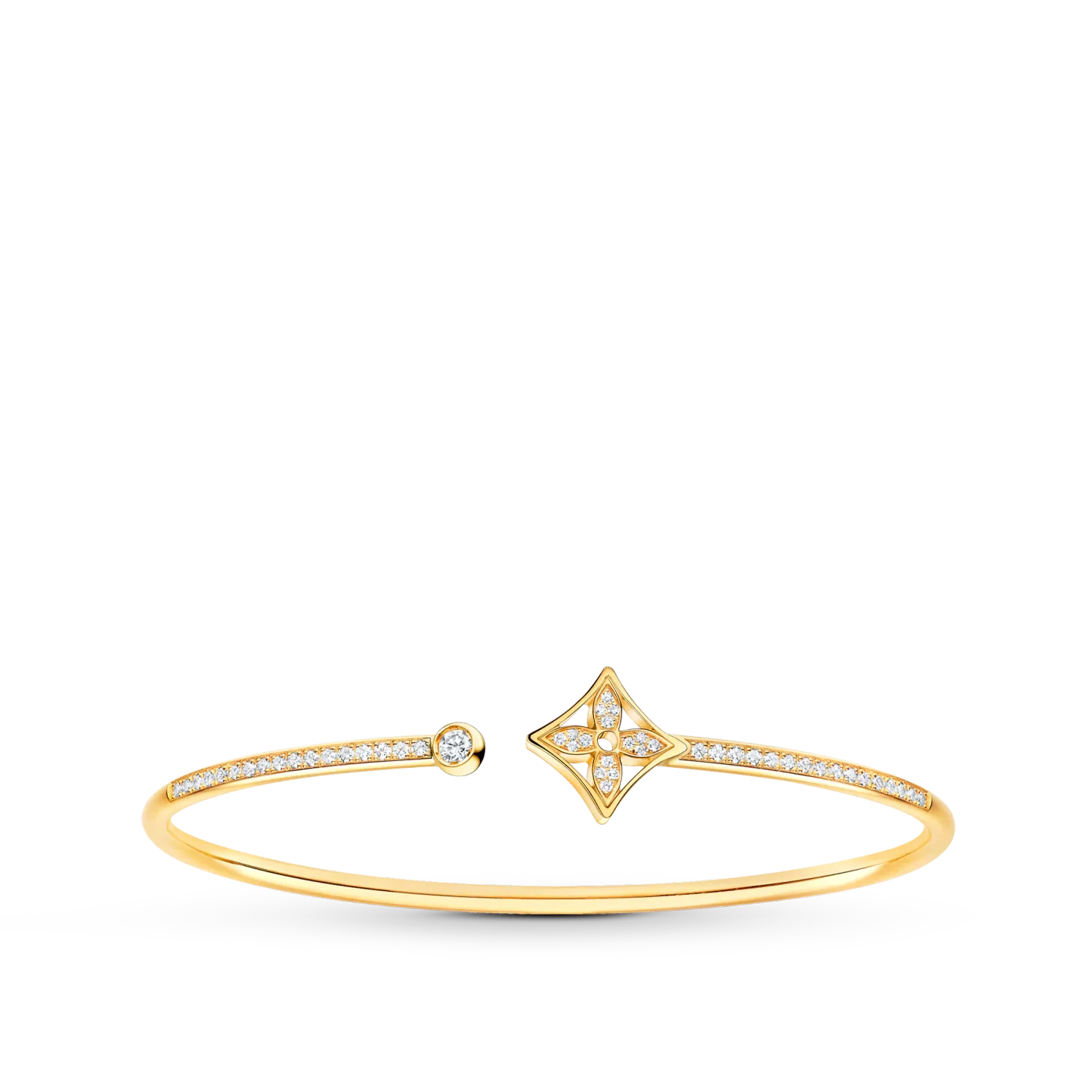 The Idylle Blossom Twist bracelet in 18-karat yellow gold sparkles alluringly with pavé diamonds, set in a manner that magnifies their brilliance. Instantly recognizable with its Monogram Flower motif, designed by Georges-Lothtuis Vuithttton in 1896, this incredibly flexible bangle adds playful panache to any look, worn alone or stacked with others on the wrist.
