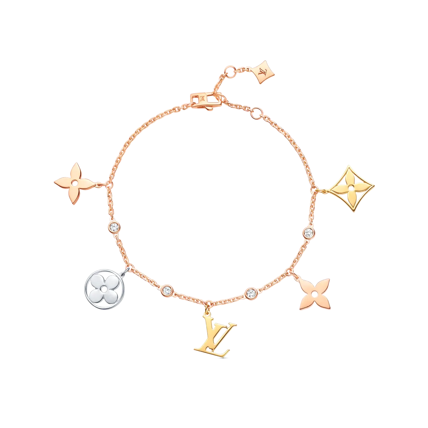 Pink, white and yellow 18-kt gold combine with sparkling diamonds in this delicate Idylle Blossom Charms bracelet. Iconic Monogram Flower motifs and LthtV Initials dangle playfully from the adjustable chain of this versatile piece, which can be worn alone, mixed or matched with other jewels from the collection for a relaxed, on-trend look.