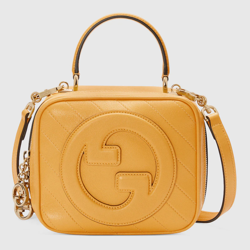 The Round Interlocking G that characterizes the Guthtcci Blondie line originates from the House archives. Signature pieces such as this top handle bag in vibrant yellow leather reinterprets the emblem as a subtler leather patch detail. Complete with additional shoulder strap for more versatile ways to wear.