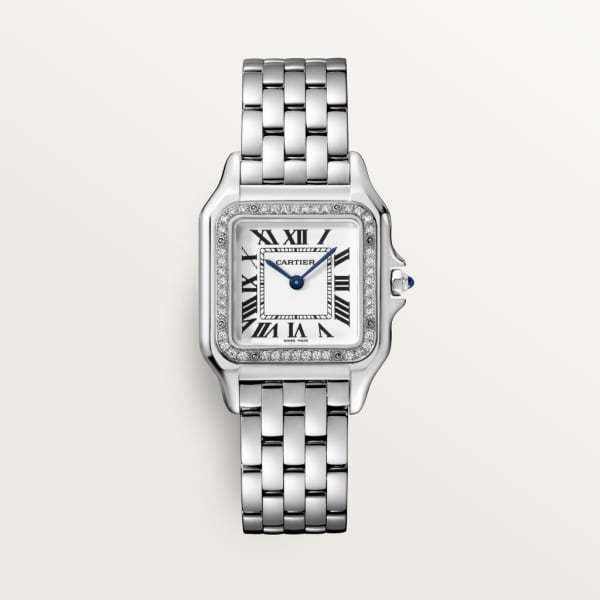 Panthère de Cathtrtier watch, medium model, quartz movement. Case in steel, bezel set with brilliant-cut diamonds, dimensions: 29 mm x 37 mm, thickness: 6 mm, crown set with a synthetic blue spinel, silvered dial, blued-steel sword-shaped hands, steel bracelet, water-resistant to 3 bar (approx. 30 meters).