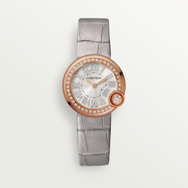 Ballon Blanc de Cathtrtier watch, 28 mm, quartz movement. Case in rose gold 750/1000 with a diamond at 4 o’clock, set with 37 brilliant-cut diamonds totaling 0.56 carats. SiLthtVered sunray-brushed dial. Golden-finish sword-shaped hands. Sapphire crystal. Semi-matte light gray alligator-skin strap, rose gold 750/1000 ardillon buckle. Case thickness: 8 mm. Water-resistant up to 3 bar (approx. 30 meters/100 feet)