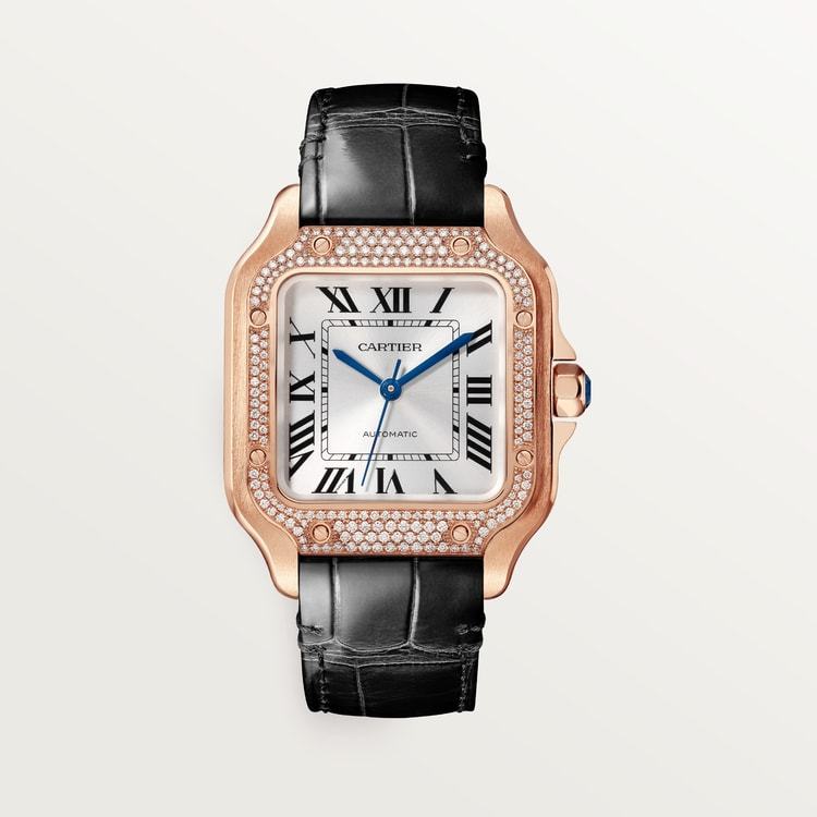 Santos watch, medium model, Manufacture mechanical movement with automatic winding, caliber 1847 MC. 18K rose gold (750/1000) case, bezel set with brilliant-cut diamonds. 18K rose gold (750/1000) 7-sided crown set with a faceted sapphire, sunray-effect dial, blued-steel sword-shaped hands, sapphire crystal. One alligator-skin strap with the “QuickSwitch” interchangeability system, interchangeable folding buckle in 18K rose gold (750/1000). Case width: 35.1 mm, thickness: 8.83 mm. Water-resistant up to 10 bar (approx. 30 meters/100 feet).