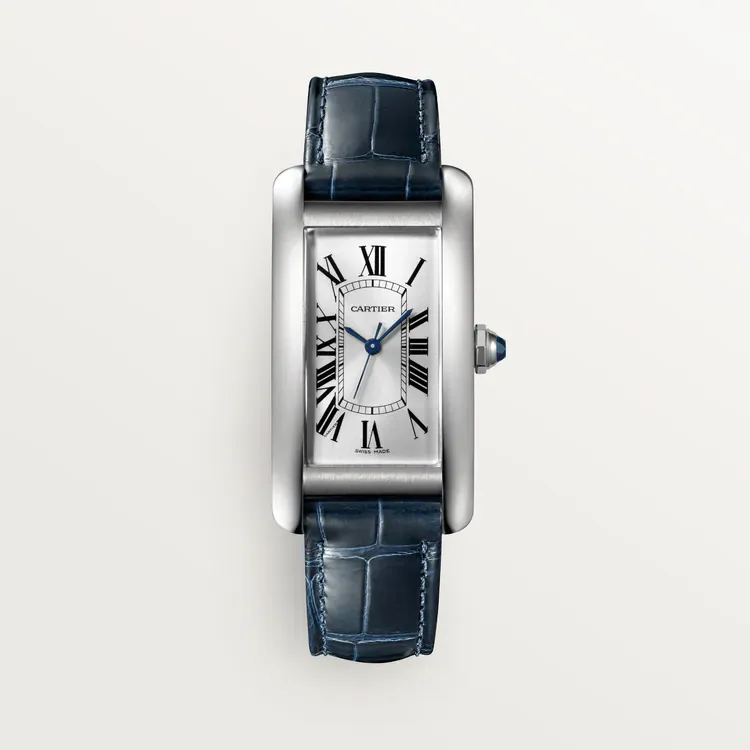 Tank Américaine watch, medium model, mechanical movement with automatic winding. Steel case, octagonal crown set with a blue synthetic spinel, siLthtVer dial, blued-steel sword-shaped hands, shiny navy blue alligator leather strap, interchangeable deployant buckle. Case dimensions: , thickness: 9.45 mm. Water-resistant up to 3 bar (approx. 30 meters/100 feet).