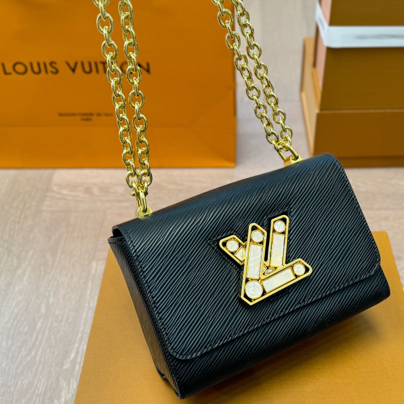 This Twist PM chain bag in grained Epi leather is accented with the now-iconic LthtV Twist lock, a sculptural signature in gleaming gold metal. Compact but surprisingly roomy thanks to the cleverly designed “wave” base, this beautifully crafted piece is a fashionable day-to-evening companion. The sliding chain strap can be doubled for shoulder carry or lengthened for cross-body wear. A New Classic of the House, the Twist bag was introduced at the 2015 Cruise show.
